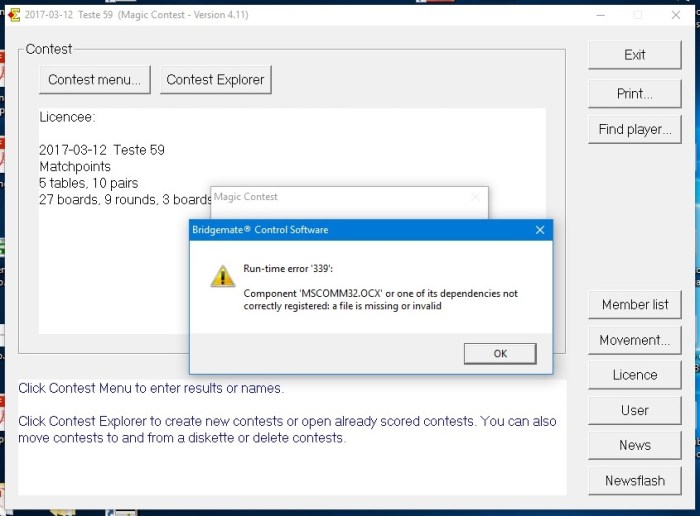 Q: Running Magic Contest for several years without any problem. After a recent automatic update to Windows 10 has happened, a problem with Magic Contest and Bridgemate Control Software has appeared. A message pops up stating that MSCOMM32.OCX is not registered, and I am unable to use BCS. See image below.